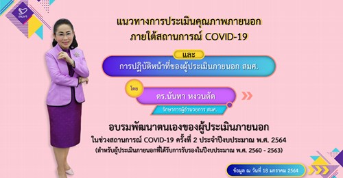 การอบรมพัฒนาตนเองของผู้ประเมินภายนอ ในช่วงสถานการณ์ COVID-19 ครั้งที่ 2 ประจำปีงบประมาณ พ.ศ.2564 (สำหรับผู้ประเมินภายนอกที่ได้รับการรับรองในปีงบประมาณ พ.ศ.2560-2563) วันที่ 19 มกราคม 2564 ผ่านการประชุมออนไลน์ Facebook Live